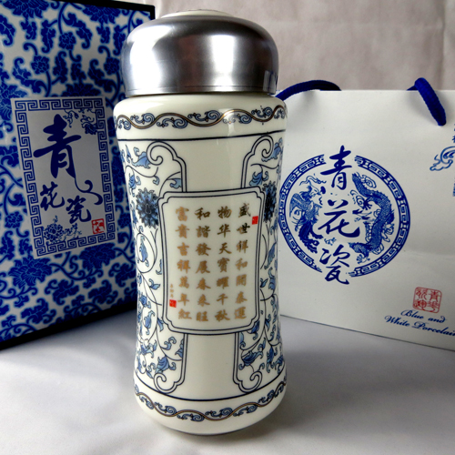 【產(chǎn)品名稱】:傳世青花--真品青花瓷保溫杯 【尺寸】:高度18.8厘米,底部直徑7.7厘米,杯口直徑5.2厘米,容量300-350ml 【產(chǎn)品描述】:本產(chǎn)品全部采用骨質(zhì)瓷,經(jīng)一千多度高溫?zé)贫桑h(huán)保健康,對(duì)人體無(wú)任何傷害。青花瓷上運(yùn)用天然鈷料在白泥上進(jìn)行繪畫裝飾,再罩以透明釉,然后在高溫1300攝氏度一次燒成,使色料充分滲透于坯釉之中,呈現(xiàn)青翠欲滴的藍(lán)色花紋,顯得幽倩美觀,明凈素雅。 【產(chǎn)品工藝】:青花瓷,是中國(guó)傳統(tǒng)元素與現(xiàn)代工藝的完美結(jié)合,具有著色力強(qiáng),發(fā)色鮮艷,呈色穩(wěn)定的特點(diǎn),胎釉上的紋飾細(xì)膩,色澤清晰,青翠欲滴,由內(nèi)而外透著一種侵透質(zhì)樸的風(fēng)骨,一種沉靜歲月的優(yōu)雅,一種柔韌的堅(jiān)持。紅陶象征紅紅火火興旺發(fā)達(dá)和吉祥如意,青花瓷則象征著生生不息波瀾壯闊和放眼天下。