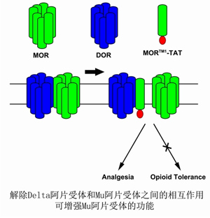 作者通過一系列的實驗發現,阻止μ阿片受體進入δ阿片受體介導的受體降解途徑可以增強μ阿片受體介導的鎮痛效力。在δ阿片受體特異性的激動劑刺激下,位于細胞膜上的δ阿片受體和μ阿片受體共同被內吞進入細胞內,并主要進入溶酶體進行降解。他們還發現μ阿片受體的第一次跨膜段介導了其與δ阿片受體的結合,因此設計了將幫助大分子穿膜的TAT肽段連接于μ阿片受體第一次跨膜段C端的干擾蛋白,用于解除脊髓痛覺傳導通路中兩類阿片受體間的相互作用。動物實驗表明,注射該干擾蛋白可以阻礙脊髓內的δ阿片受體和μ阿片受體相互作用,不但提高了嗎啡的鎮痛效果,而且降低嗎啡的耐受作用。這些結果提示,激活δ阿片受體可以造成兩類阿片受體的共同內吞和降解,該機制對μ阿片受體的脫敏起著很重要的調節作用。該研究結果為提高阿片類鎮痛劑的鎮痛效果提供了一種新策略。 該工作得到了中國科學院、科技部973項目、國家自然科學基金等項目的資助。 |