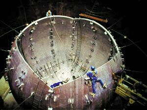 工人向目標靶室內裝填“人造太陽”的核心裝置 在加利福尼亞州利弗莫爾國家實驗室,一座神秘的建筑物仍在修建中。過去十多來年,這個龐大的建筑物一直是環保主義者關注的焦點。然而,11月2日,這里進行的一次點火實驗震動了科學界。因為作為世界上第一個能產生持續核聚變的反應堆,“人造太陽”一旦成功將改寫人類的歷史。 地球上造“小太陽” 現今人類可利用的最大、最具商業價值的能源無疑是核能。核電站利用核能的原理是核裂變,即在高溫高壓狀態,把鈾或钚等重原子分裂成輕原子,導致其釋放大量能量的核反應方式。但是國家點火裝置利用核能的方式則反其道而行之,不是核裂變,而是核聚變。核聚變是指由質量輕的原子,主要是指氘或氚,在高溫高壓下,發生原子核互相聚合作用,生成新的質量更重的原子核,并伴隨著巨大的能量釋放的一種核反應形式。太陽發光發熱就是利用核聚變產生的能量。 與核裂變相比,核聚變不僅安全,而且相對環保。利弗莫爾國家點火裝置曾對媒體說:“太陽產生的光和熱抵達地球,不會產生任何放射性的副產品,而且能長期高效的生產。如果把太陽換成我們正在研究的核聚變反應堆,就等于在地球上建造了一個提供清潔能源的小太陽。” 釋放1.3兆焦耳能量 目前,這個“小太陽”已經初具規模,并且已經進行了令人鼓舞的試驗,獲得了寶貴的試驗數據。利弗莫爾國家點火裝置的一個科研組說,11月2日他們向核聚變反應堆中心發射192束激光束,用它們瞄準一個只有花生大小卻包含氘和氚氣體的小球體。這個小球體釋放的能量高達1.3兆焦耳,其核心最高溫度大約是600萬華氏度。 國家點火裝置主管愛德華·摩西說,盡管這次試驗沒有能夠達到太陽中心溫度2700萬華氏度,也沒有引發期待中的持續性核聚變反應,但這些試驗結果依然非常振奮人心。摩西還稱,美國科學家有決心在2012年實現這一目標。 意義 “人造太陽”研究惠及后代 要想實現核聚變燃燒,首先必須點燃由氫的同位素氘和氚構成的特殊燃料。 20世紀70年代,科學家開始利用強大的激光束進行試驗,壓縮和加熱氫的同位素,使其達到熔點,這一技術被稱作慣性約束核聚變。激光發射器的作用就是促使這種核聚變快速和持續產生,包含氘和氚氣體的目標物受到外部的刺激后,將發生爆炸形成沖擊波,進一步加快目標物核心的燃燒,這種燃燒的持續性也更長。 一旦這種核聚變成現實,國家點火裝置內靶室的溫度會超過1億華氏度,內部壓力將超過地球大氣壓的1千億倍。國家點火裝置主管愛德華·摩西說:“為了在實驗室里產生核聚變燃燒,我們進行了長達10年的研究。目前利用核聚變或核裂變產生能量的核電站,在過去50多年已經讓發電量大幅增加,但迄今仍未證明利用氘和氚氣體融合后持續燃燒產生能源的方法可以投入使用。”因此摩西說,“人造太陽”試驗的意義不言而喻,“一旦我們掌握了實現太陽內部核聚變的技術,我們的子孫后代將享受到科技發展帶來的飛躍,能源短缺的時代將一去不復返。” 結構 130噸重目標靶室是核心 從上世紀90年代后期開始,利弗莫爾國家實驗室就開始建造“人造太陽”,至今整個計劃已投入約35.5億美元。11月2日進行的綜合點火試驗是迄今以來最成功的一次試驗。未來,還有更復雜和更具挑戰性的試驗在國家點火裝置里上演。 國家點火裝置是一棟10層樓高的建筑物,其面積相當于三個足球場。媒體稱,這個點火裝置是世界上最大的激光科學建設項目,因而成為全球“人造太陽”試驗的中心,承載著人類利用新能源的夢想。國家點火裝置控制室有一套十分先進的電腦自動控制集成系統,它模仿了休斯敦美國宇航局的任務控制中心,被稱為史上科學儀器設計最復雜的自動控制系統之一。 國家點火裝置內部設有130噸重的目標靶室,這是“人造太陽”計劃最核心的部分。靶室里的中心孔洞直徑達10米,用30厘米厚的混凝土掩埋,旁邊有192個激光器向其中發射中子,以點燃反應堆,并促使包含氘和氚氣體的玻璃物目標產生極大的高溫和高壓。 這個靶室的條件將接近或達到太陽內部核聚變反應時的條件。電腦自動控制集成系統保證了試驗的穩定性,因為850臺電腦使激光器發射激光的間隔不超過50微秒。 應用 世界掀起“人造太陽”熱 “人造太陽”技術可行性高、應用前景廣闊,實際上,除了美國的“人造太陽”計劃,中國、俄羅斯等世界大國目前都在研究類似“人造太陽”的核聚變技術。 國家點火裝置“人造太陽”中的核反應堆目標物是氘和氚,氘可以利用并不復雜的技術,從海水里萃取;氚在金屬鋰中存在,鋰則是土壤里的一種常見元素。所以氘和氚在現實中的開采和利用,相比核裂變要使用到的鈾或钚更為簡單易行。 國家點火裝置在其網站上對氘和氚的利用前景作了形象的對比。他們舉例稱,由于海水中包含氘元素,經過一定的轉化,1加侖海水可提供相當于300加侖汽油產生的能量,50加侖海水產生的燃料所含的能量,相當于2噸煤。“它們很環保,大規模應用后,可以減少對化石燃料的使用,從而大大降低碳排放量。” 更為重要的是,氘和氚沒有鈾或钚那樣劇烈的放射性,未來使用它們做反應堆生成的放射性副產品,也比當前核裂變核電站少。 國家點火裝置的官員估計,使用核聚變反應堆的發電站將在2020年開始運行,到2050年將有25%的美國民用能源由核
