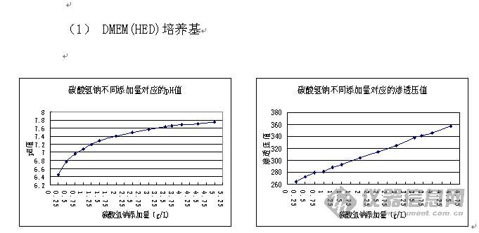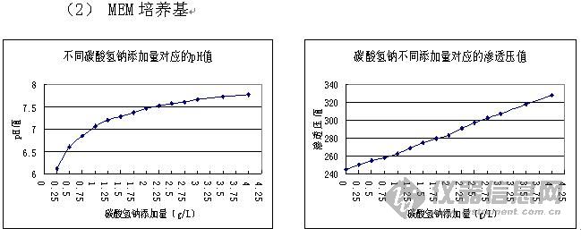 酚紅在培養基中被用來作為pH值的指示劑,研究表明,酚紅可以模擬固醇類激素的作用(特別是雌激素),為避免固醇類反應,用無酚紅培養基。 5. 在新鮮培養基中添加了血清和抗生素后,有效期是多長? 一旦您在新鮮培養基中添加了血清和抗生素時,您應該在兩到三周內使用它。因為一些抗生素和血清中的基本成分在解凍后就開始降解。 6. 為什么不要用碳酸氫鈉調pH值? 如圖所示,培養基pH值隨著碳酸氫鈉量的增加,呈拋物線增長,當碳酸氫鈉加到一定量時,pH變化越來越小。而培養基的滲透壓值隨著碳酸氫鈉量的增加,呈直線增長,碳酸氫鈉量越大,滲透壓值越大。 如果為了達到工作pH值僅加入少量的碳酸氫鈉,而忽略滲透壓,一來可能會達不到緩沖效果而引起細胞培養過程中pH值變化較劇烈,二來會使培養基成為低滲溶液,在培養細胞時易造成細胞膨脹破裂;如果為了達到工作pH值而加入大量碳酸氫鈉,一來可能會難以達到期望的pH值,二來會使培養基成為高滲溶液,在培養細胞時易造成細胞萎縮。 生產中最好通過實驗找到合適滲透壓和pH值情況下的碳酸氫鈉加入量。下面是DMEM(HED)和MEM培養基的碳酸氫鈉與pH值、滲透壓的曲線。 ![]() ![]() 7. 細胞生長質量很好,為什么病毒、蛋白表達量沒有提高?
