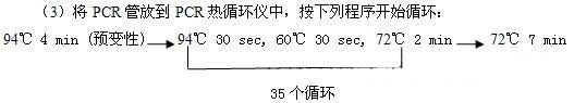 (1)PCR反應混合液的配制:反應體系25 µL, 在無菌的0.2 mL離心管中按下列操作程序加樣: